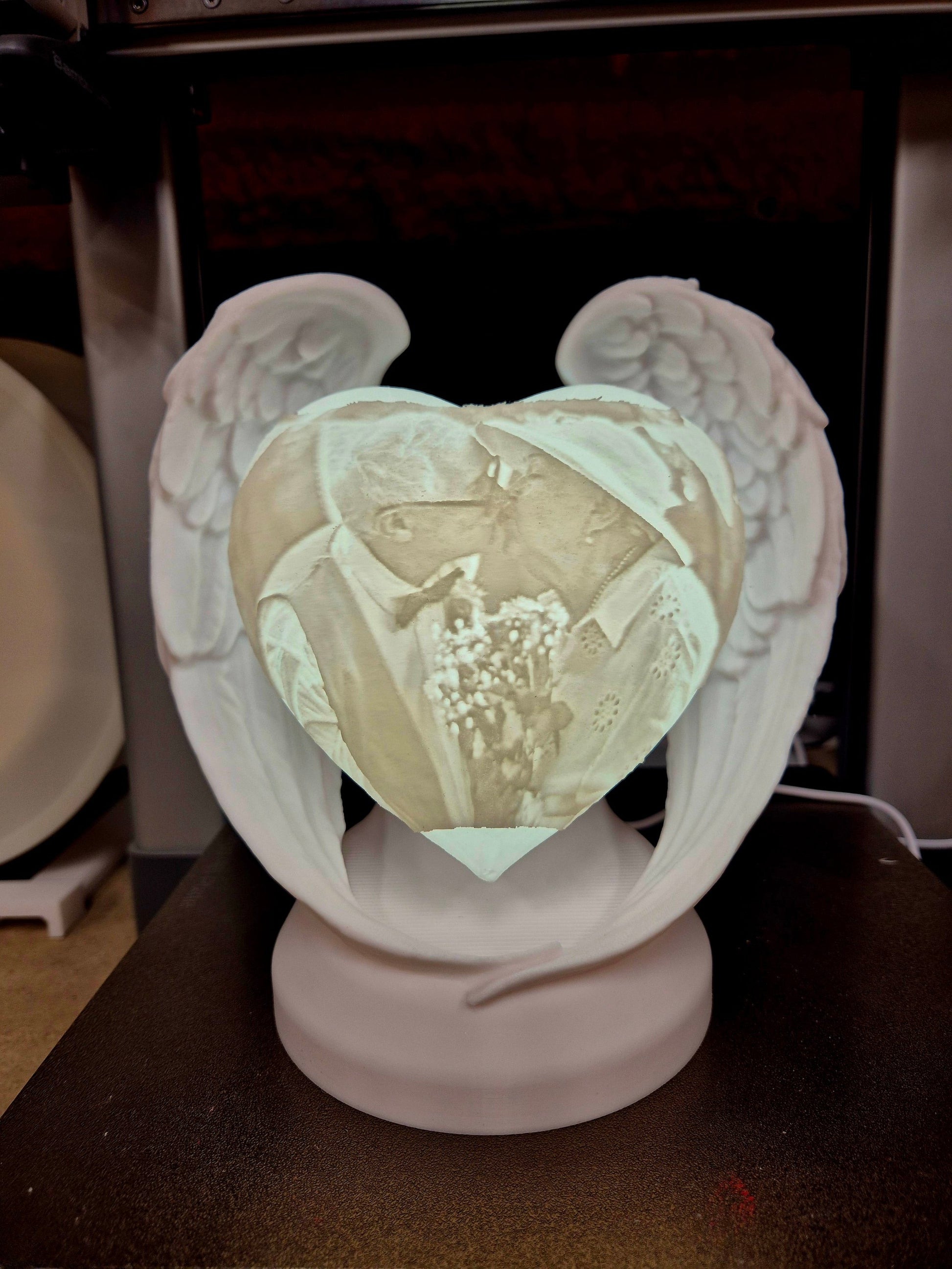 Honor your loved ones with the Angel Heart Memorial Lamp, a beautifully crafted piece designed to bring comfort and light to your home or graveside. Featuring an intricately detailed angel cradling a glowing heart, this lamp showcases a custom photo illuminated by soft, warm LED lighting.