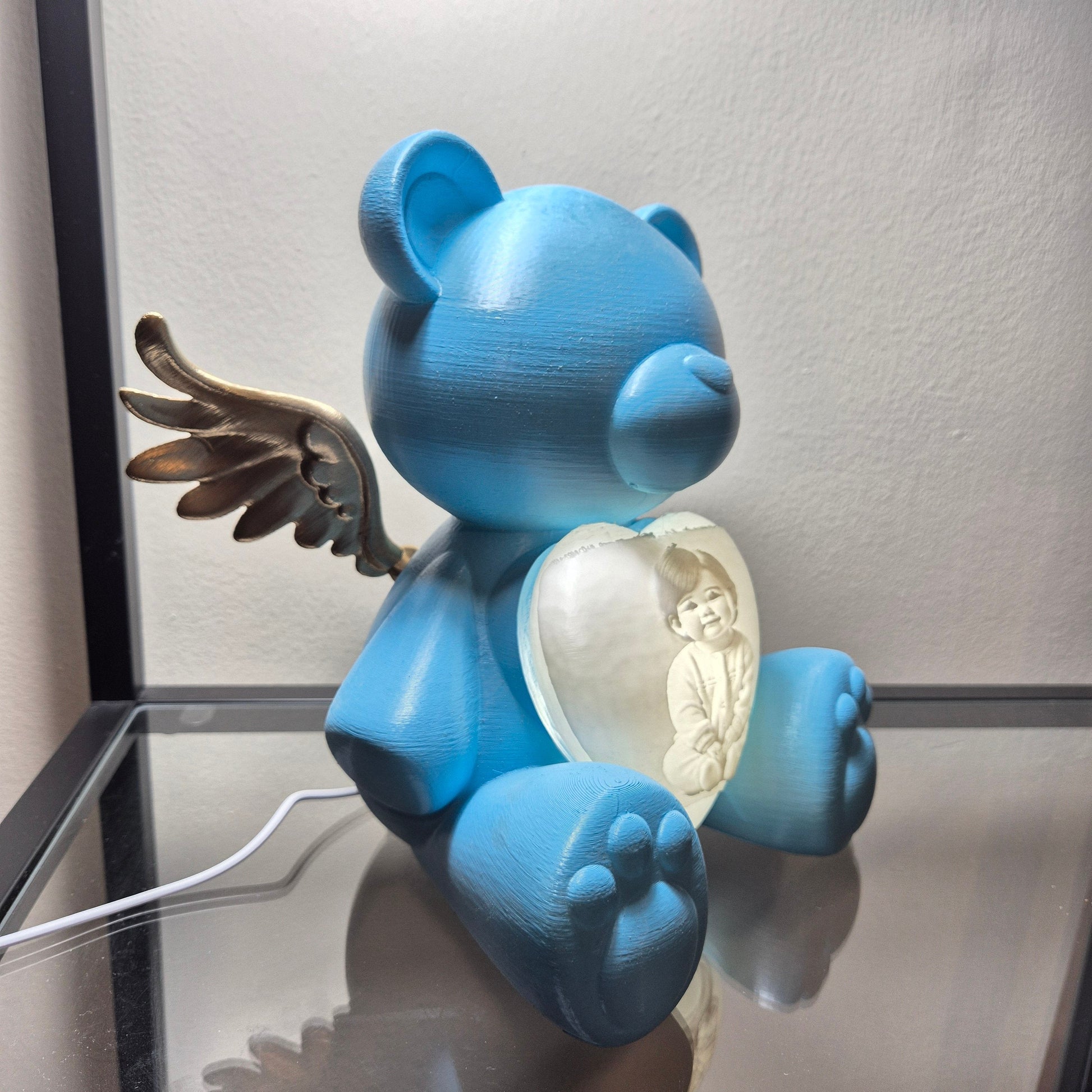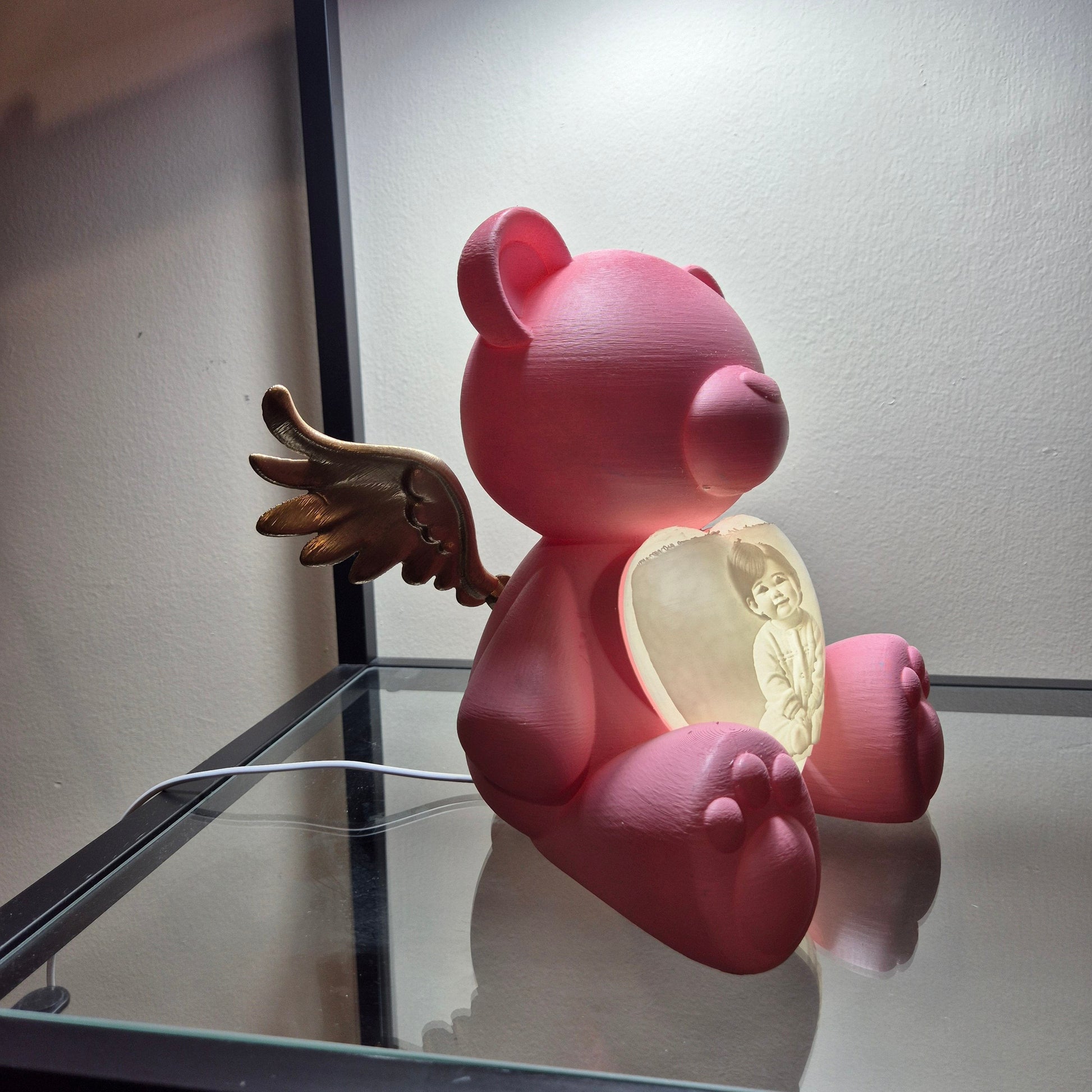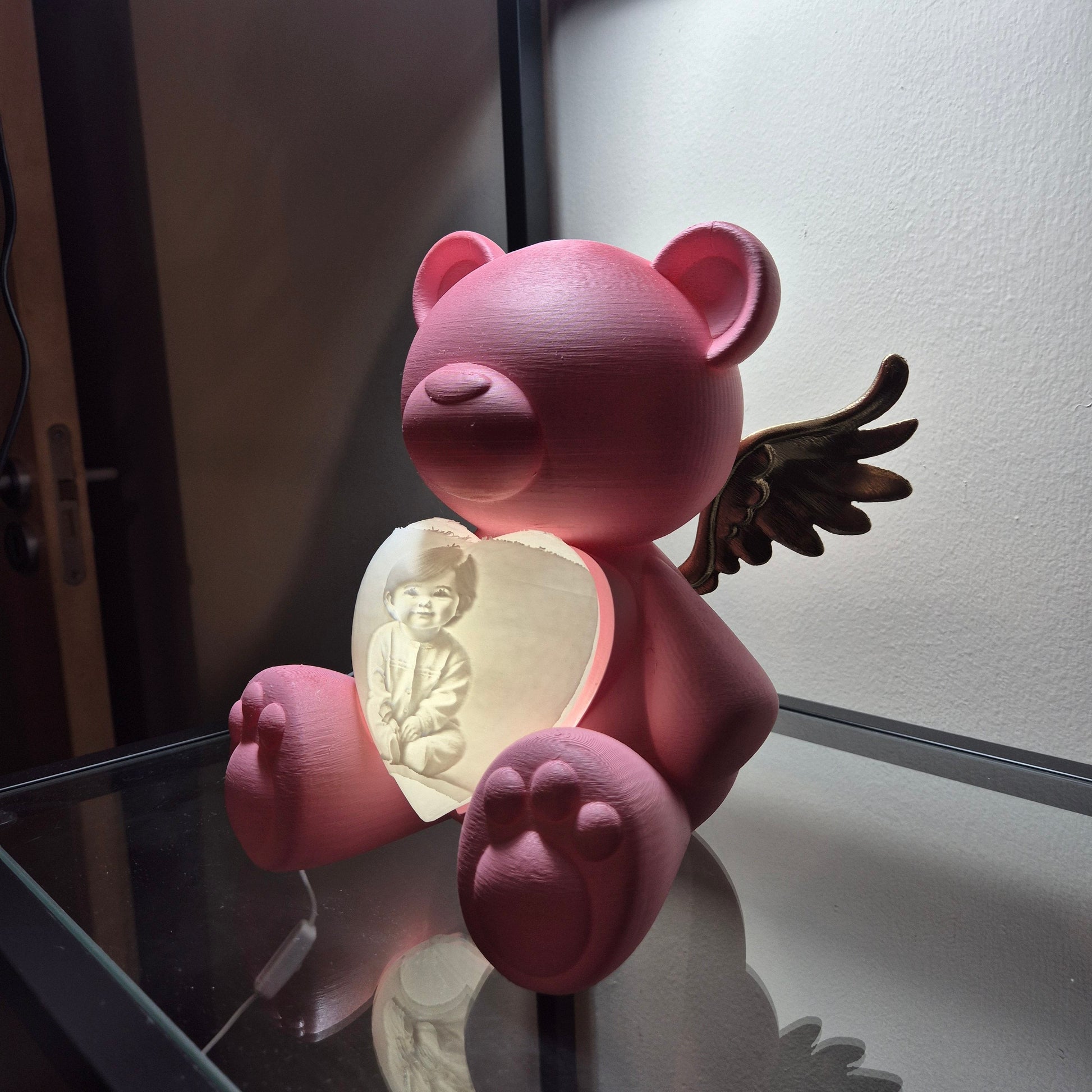 Adorable teddy bear design holding a glowing heart-shaped photo centre
